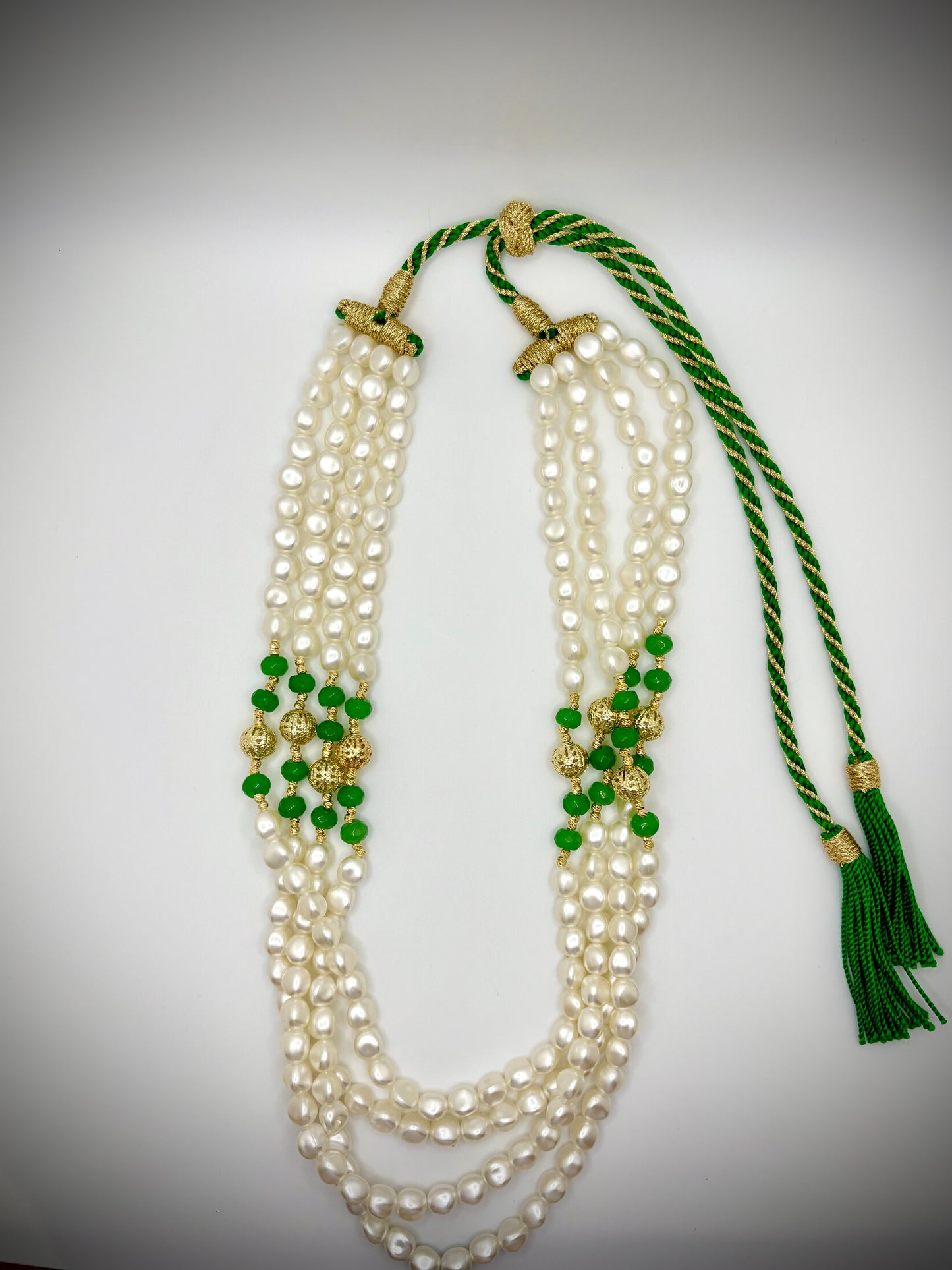 This unique choker begins with four strands of lustrous pearls, interspersed with green and golden beads for a harmonious blend of colors. The design transitions seamlessly into golden and green threads, adding an elegant continuation and adjustable functionality to ensure a perfect fit for all.