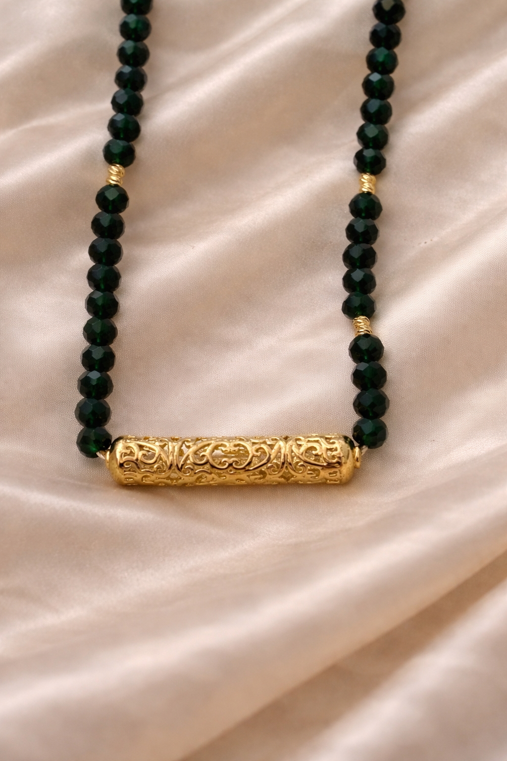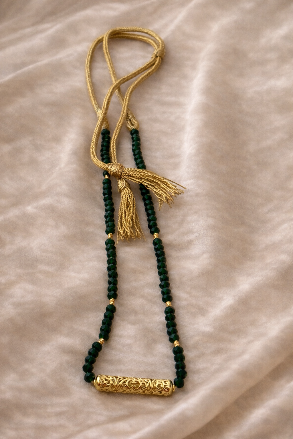 A statement necklace featuring green beads adorned with scattered golden beads for added flair, culminating in a Moroccan centerpiece radiating traditional sophistication. The design transitions into golden threads, creating an elegant continuation.