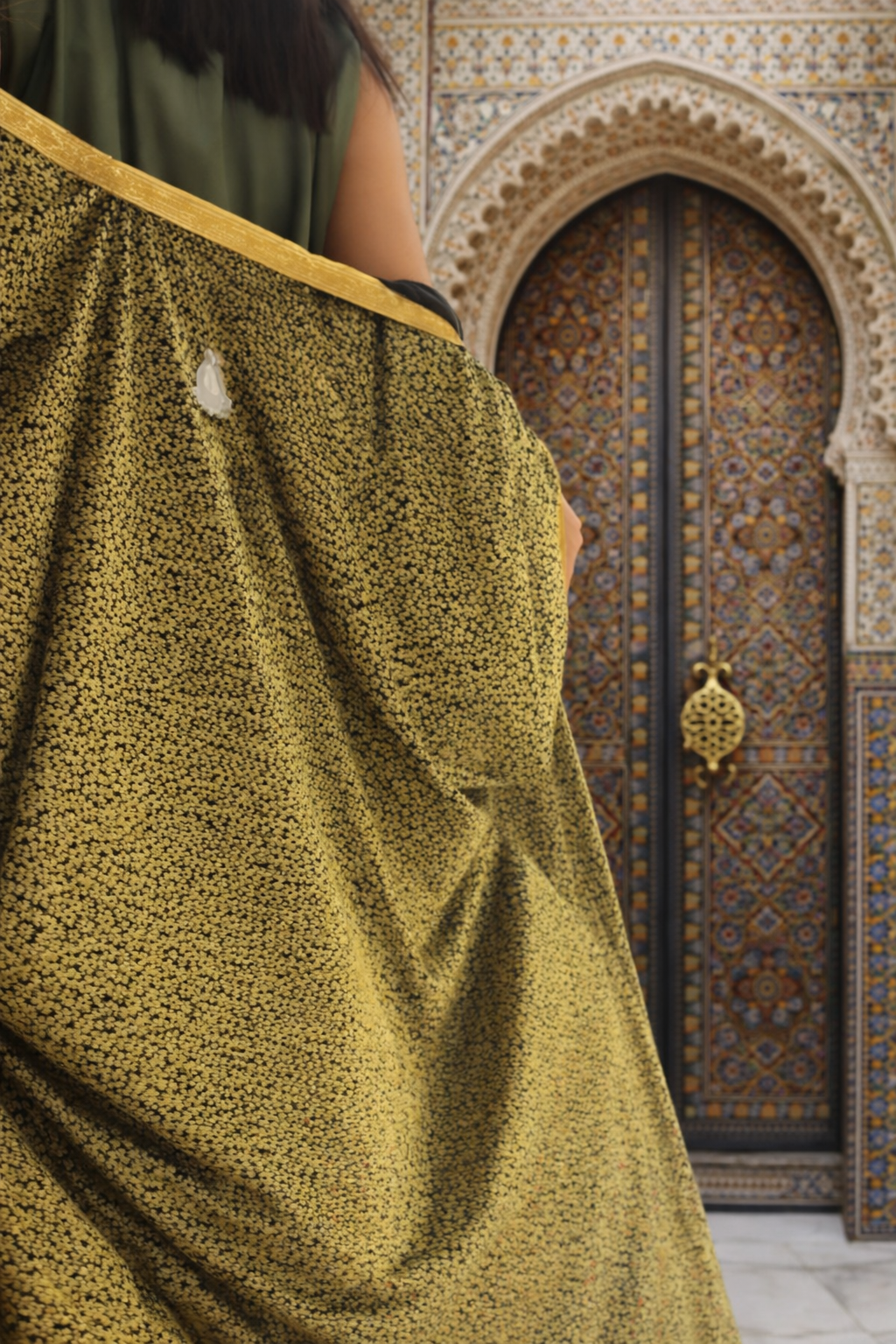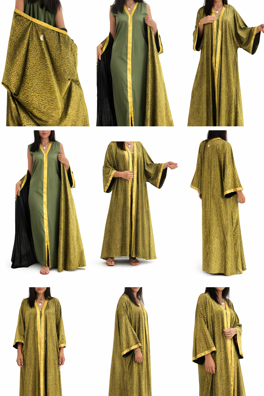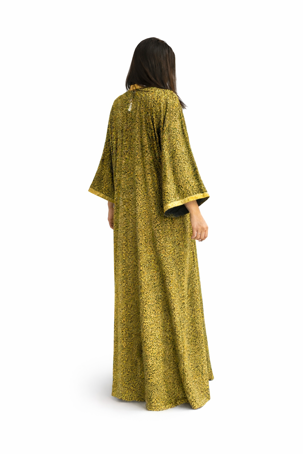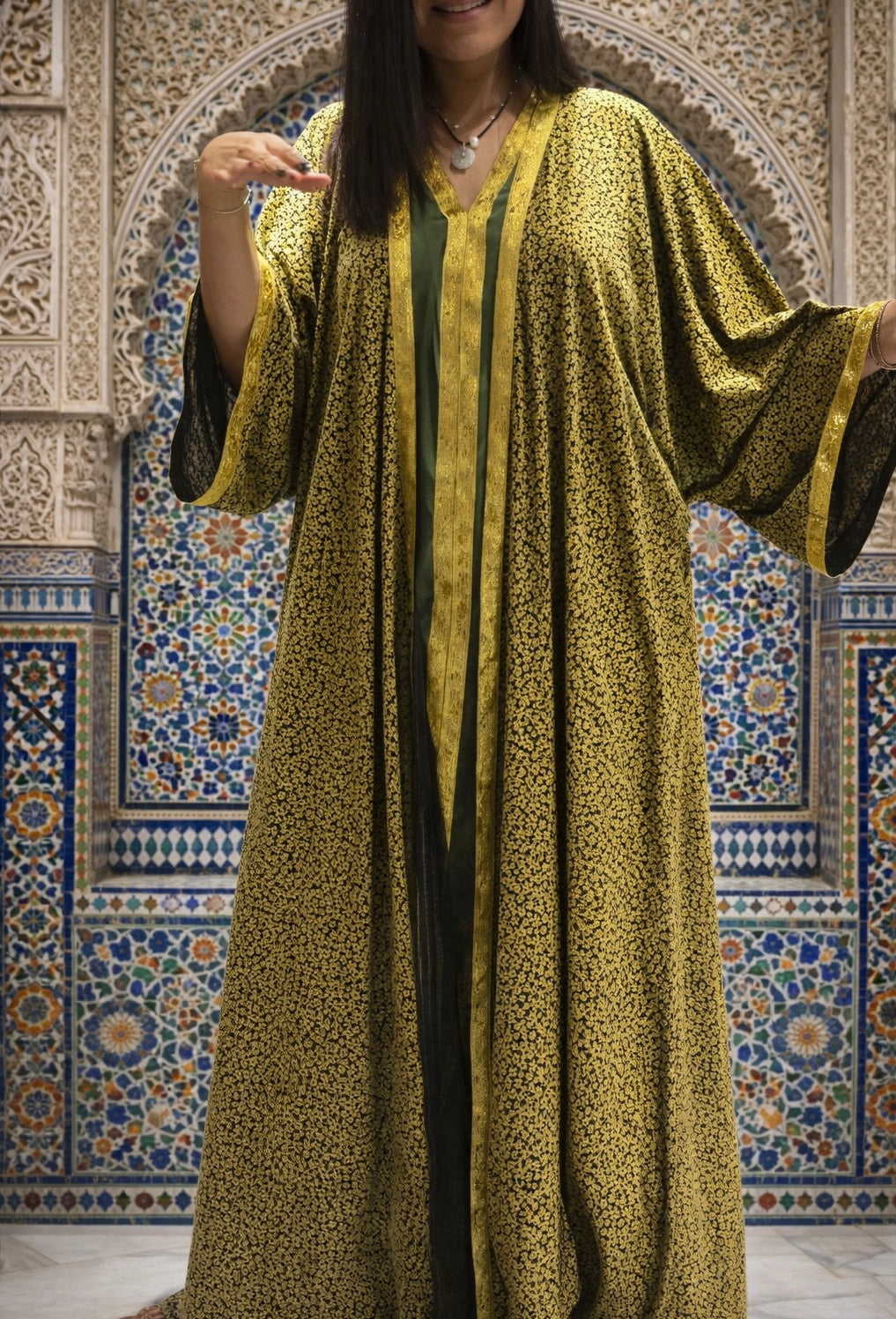 Lalla Soraya is a handmade kaftan designed for effortless elegance. Featuring a rich olive green front with refined gold trim and a flowing gold-patterned back, this piece offers a timeless and flattering silhouette.